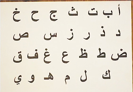 Laminated letterboard of Arabic letters with numbers and maths signs on the back.